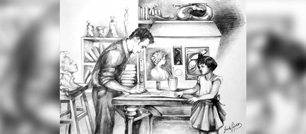 Era la década del 60 y este es mi recuerdo más antiguo de haberlo observado mientras trabajaba. Muchas veces —en un largo recorrido de edades y tiempos— volví a pararme a su lado mientras modelaba, dibujaba o pintaba. Así aprendí algunas habilidades relacionadas con las maneras en que había que coger el lápiz para hacer un trazo limpio o el pincel, para esbozar una línea a mano alzada; aplicar pegamentos, calar en la cartulina y utilizar otros artilugios propios de la creación plástica, aunque nunca me dediqué a ella ni heredé esa vocación.