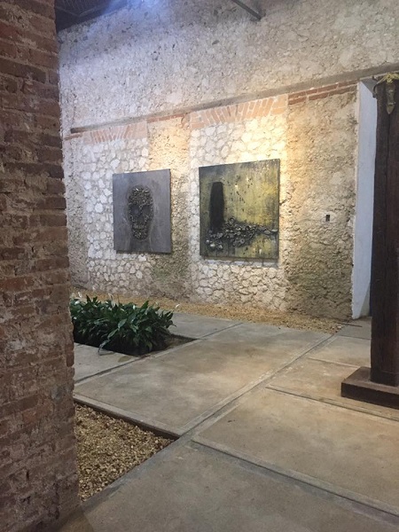 Dentro de un espacio rectangular con un pasadizo perimetral de gravillas y dos canteros en los que prosperan hermosas flores blancas, y con paredes para un alto puntal que hacen valer la intencionada imagen de lo no terminado, las obras de Johny conviven en espléndida integración para ser parte y todo de este antojado “jardín”. Las superficies de los lienzos soportan objetos que discursan —a veces— con el tono de un pensado horror al vacío, ese de un objeto sobre otro o de la aglomeración de ellos para un insólito “collage”, como pudieran haber dicho también otros colegas que han estudiado la obra de este artista. Este diseño, no obstante, se hace más enfático, para inducirnos a una lectura de la posible historia de esos objetos, o a la inversa, la historia sin explícitas lecturas, algo de lo que se encargan los titulares de piezas como Homenaje a Antonia, Dead Horse, Robusta, Homenaje a Victoria, Conversando con Dubuffet, Contenedor de historias…