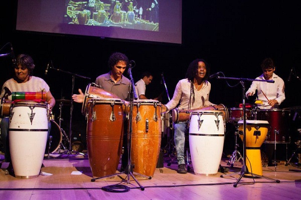 Un alto en la conversación. Cinco chicos irrumpen con tres tumbadoras y un timbal, una señora invita a bailar rumba. "Caballero esto le zumba”. Los presentes palmotean, y hasta la simpática invitada demuestra sus dotes para el baile. La agrupación Percuba Ensemble deleita con su propuesta de fusión de la percusión folclórica y la contemporánea.