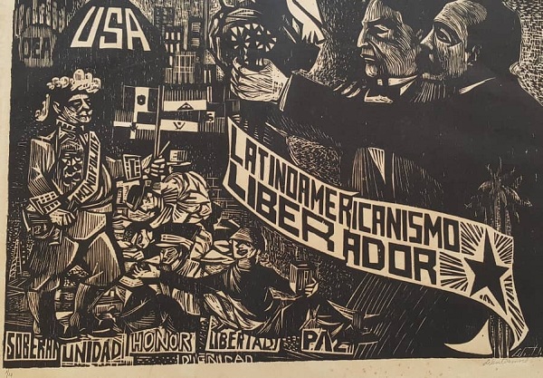 Así nació la majestuosa pieza Latinoamericanismo liberador,[1] en alusión a la frase de Fidel: “(…) La Asamblea del Pueblo de Cuba proclama el Latinoamericanismo liberador que late en José Martí y en Benito Juárez”. [2] Se trata de una pieza de impecable factura, donde la artista logra plena armonía de técnica y contenidos. Es preciso recordar que para la generación que estuvo activa en las décadas del sesenta y del setenta, resultó inevitable el protagonismo, casi irrepetible del grabado, a cuenta de ser la técnica de impresión más viable para reproducir en grandes cantidades y a bajo costo las líneas de mensajes que exigía ese momento histórico, a la par que resultó la mejor solución ante la carencia de materiales tradicionales como lienzo, óleos y tintas, entre otros.