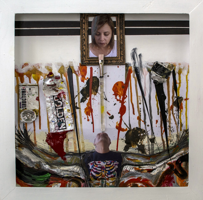 La exposición está compuesta por obras de 50 x 50 centímetros —todas realizadas en 2016—, y cada una encierra una historia relacionada con la cotidianidad del cubano: el amor, la relación de pareja, la convivencia, la emigración, la música, la ciudad que habitamos, la amistad. Son esos algunos de los grandes temas que atrapa Andy en estos retablos repletos de sugerencias e insinuaciones inteligentes. En Posdata el artista ha querido entremezclar tres lenguajes: la pintura, la fotografía y el objeto.