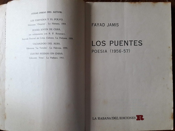 Antes de Los puentes, Fayad Jamís había publicado dos libros: Brújulas (Guayos: edición del autor, 1949), en la órbita aún del neo-romanticismo pese a sus hallazgos, y Los párpados y el polvo (La Habana: Orígenes, 1954), un clásico de la poesía dialógica cubana. Aunque, en opinión del autor, este brillante segundo libro padece de una “gran tendencia al hermetismo” (Bejel 4). Ese mismo año “me fui a Francia. Las cosas terribles de aquellos años crearon en mí, […] en la mayoría de los cubanos, un verdadero asco” (Castellanos 22). Son los años en Cuba de la dictadura de Fulgencio Batista, quien había llegado al poder en 1952 por un golpe de estado y que fue derrocado en 1959. Sobre las circunstancias de este desplazamiento nos cuenta el autor: “un joven que llega de las Antillas, […] lleno de conflictos humanos que van de lo familiar, pasando por lo racial, lo económico y lo artístico-literario, va a perderse más allá de las paredes grises […] de una ciudad gris” (Palabras 10). En esas condiciones, “la poesía no podía seguir siendo igual. Vinieron las lecturas de Apollinaire, [Paul] Eluard, [Arthur] Rimbaud, [Charles] Baudelaire, [Isidore Ducasse, conde de] Lautrémont, [O. V. de Lubicz] Milosz” (Palabras 10). Y vino también “una vida de trabajo constante, de responsabilidades; una vida consciente de sí misma, de frente a las realidades más diversas; una vida de individuo que vive en el filo del siglo XX y que pertenece a esa raza grandiosa y miserable que es la humanidad” (Palabras 10). Jamís añade que nunca creyó que “al poeta que le haya tocado vivir entre seres que vienen de los pueblos más apartados, de las tribus más profundas y misteriosas, en circunstancias bastante particulares y habiendo decidido vivir, con la intensidad para la cual su sangre y su espíritu lo habían preparado”, pudiera al cabo “seguir escribiendo como él mismo lo hacía diez años atrás” (Palabras 10-11).