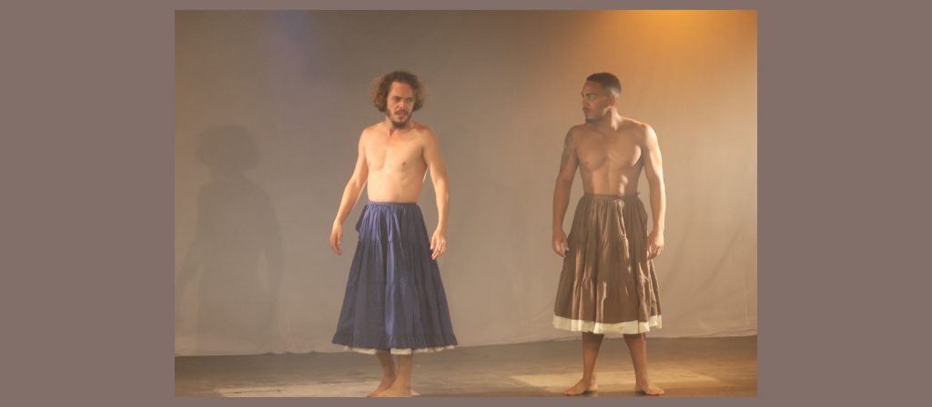 Tres hombres en escena. Visten sayas que tapan sus pies, camisas de mangas largas y corbatas. Luego, shorts y camisas floreadas. Más adelante, atuendos religiosos. Uno, calzoncillos y tacones. Otro, pantalón y camisa vaporosa. Ambos, después, desnudos. A veces son cuatro, o cinco. Y una mujer.