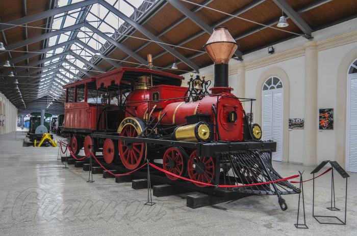 Y llegamos a una sala que se aparta mucho de las características de cualquier museo tradicional. En ella mostramos nuestra principal pieza museable: una locomotora del año 1843 con todos sus implementos, que conserva su nombre original, La Junta. Aquí la llamamos “la vedette”. La hemos nombrado así porque es la locomotora más antigua conservada en Cuba, Iberoamérica y el Caribe. Con ella se inauguró el ferrocarril de Matanzas. Su valor también reside en que fue concebida por un constructor norteamericano y es la única locomotora realizada por él que existe en el mundo.