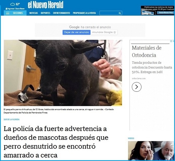 Un titular aparecido en la portada matutina de El Nuevo Herald, conmueve a sus lectores hasta las lágrimas. Con secreciones nasales, hipidos y todo lo demás: “La policía da fuerte advertencia a dueños de mascotas después que perro desnutrido se encontró amarrado a cerca”.