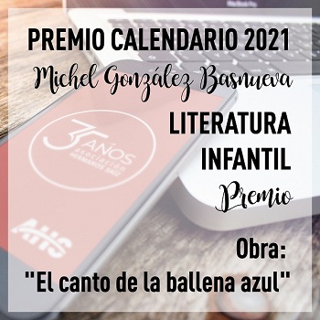 Por último, otorgar el Premio Calendario 2021 a El canto de la ballena azul, presentado bajo el seudónimo “Marcos” que, al abrir plica, responde al nombre de Michel González Basnueva. Con una eficiente estructura y manejo de los recursos narrativos y un depurado lenguaje desprovisto de sensiblería y lugares comunes, el autor explora en el complejo tema del uso de las redes sociales y, con habilidad, teje la historia de cuatro jóvenes marcados por la soledad y la incomunicación. Novela de sensibilidades. Se trata de una obra que va más allá de circunstancias locales en tanto nos coloca frente a dramas universales.