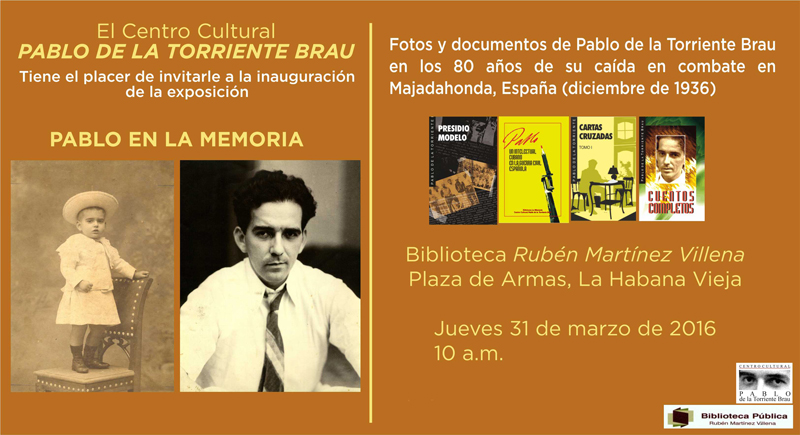 Este jueves 31 de marzo a las 10 de la mañana, Día del Libro Cubano, el Centro Cultural Pablo de la Torriente Brau inaugurará en la Biblioteca Pública Rubén Martínez Villena de La Habana Vieja la exposición Pablo en la memoria, que propondrá revisitar un conjunto de volúmenes dedicados a descubrir la vida y obra del héroe de Majadahonda o firmados por el joven escritor y revolucionario de la generación del 30.