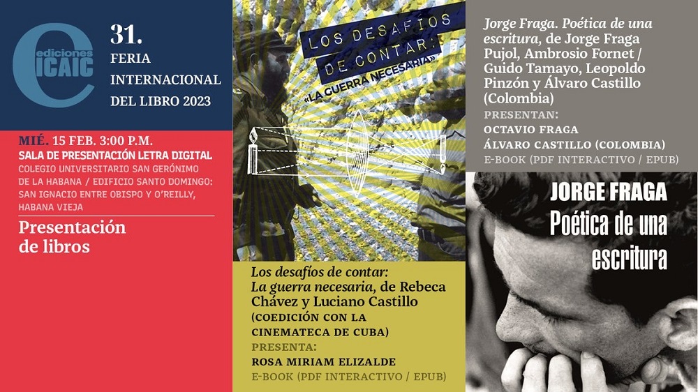 El miércoles 15, a las 3:00 p.m., los especialistas, críticos e investigadores del cine cubano conocerán dos nuevos títulos de Ediciones ICAIC: Jorge Fraga. Poética de una escritura, de Jorge Fraga, Ambrosio Fornet, Guido Tamayo, Leopoldo Pinzón y Álvaro Castillo, y Los desafíos de contar la Guerra Necesaria, de Rebeca Chávez y Luciano Castillo. Jorge Fraga. Poética de una escritura, con prólogo del intelectual cubano Ambrosio Fornet, incluye un curso que el realizador y profesor cubano impartiera sobre la construcción del guion en la Universidad Externado de Colombia, además de otros textos de autores colombianos y cubanos. La publicación devuelve a la memoria la obra de un realizador, fundador del Icaic y profesor de la Universidad de La Habana, la Escuela Internacional de Cine y Televisión, y otras instituciones educativas y académicas.