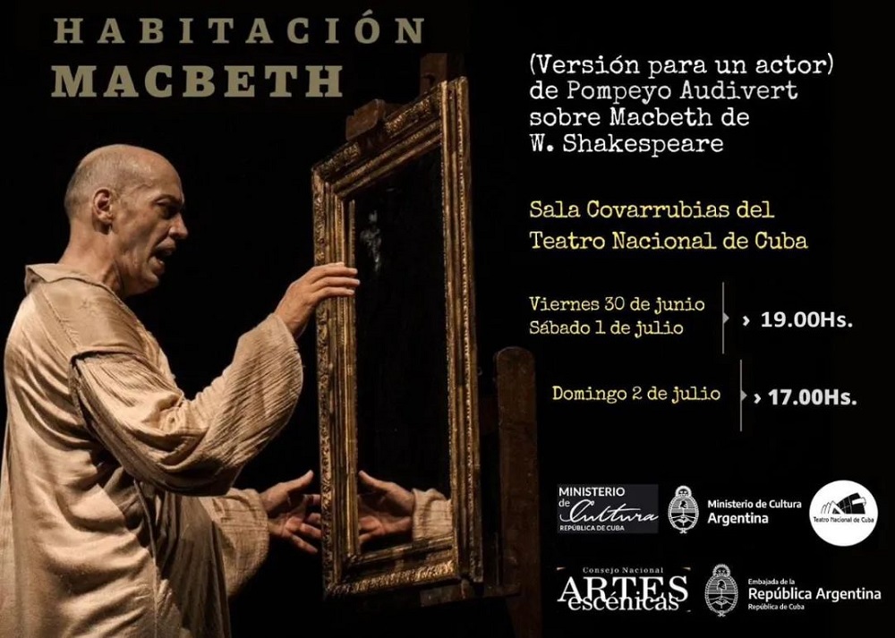 “Habitación Macbeth es el intento de arrojar junto a Shakespeare un piedrazo en el espejo, en el nivel de las formas de producción, de transparentar la estructura soporte, la máquina teatral y su metáfora, sin menguar la extraordinaria potencia poética que sostienen sus efectuaciones ficcionales, por el contrario, mestizándose con ellas, acrecentándolas, defendiendo la máscara (Macbeth), pero también sus misterios sagrados, su ser artificio ritual de una presencia (nos otros) que siempre evade la emboscada que el teatro le tiende amorosamente para develarla, y que tal vez sea la nuestra en esa latitud de ser sin máscaras”. Así se presenta la obra que trae Audivert a Cuba.