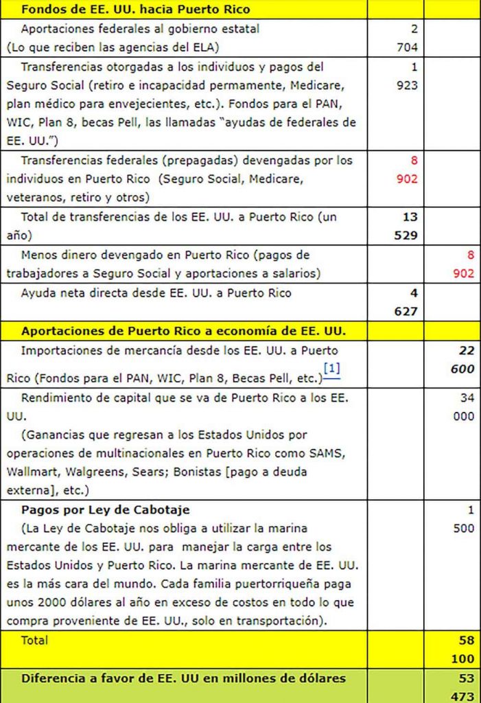 Se publicita mucho el mito de que Puerto Rico depende de “transferencias de fondos federales”, pero esta publicidad oculta por un lado la gran porción que se lleva el sistema imperial de nuestra riqueza, tanto así, que diversos economistas coinciden en que por cada dólar que el gobierno de Estados Unidos transfiere a Puerto Rico, su economía extrae de cuatro a siete dólares. Y por otro lado, se mezcla como “transferencia” pagos como los de retiro del Seguro Social que todos los trabajadores pagamos al Tesoro de Estados Unidos. Esta transferencia es invisible cuando es extraída al trabajador, porque se descuenta un 15 por ciento de su salario por unos 40 o 50 años; es dinero que nunca recibe, pero que paga. Luego, a la edad del retiro, lo recibe como una dádiva yanqui.
