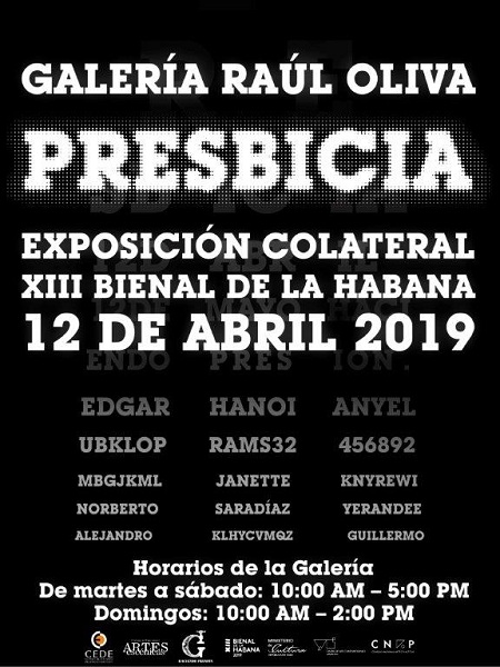 PRESBICIA, para la Galería Raúl Oliva, significa un importante punto de giro en su historia ya de un poco más de diez años. Es la primera vez que una carga artística “otra” llega a sus predios exhibitivos y, en esto, sus dos curadores-organizadores (Edgar Hechavarría y Sara Díaz, artistas también participantes en ella) para no alterar en demasía ese viraje, le impusieron un “tour de force” a los otros creadores que en ella confluyen: Anyelmaidelin Calzadilla, Alejandro Sainz, Guillermo Malberti, Hanoi Pérez, Jannette Brosaaard, Norberto Marrero y Yerandee Durán…
