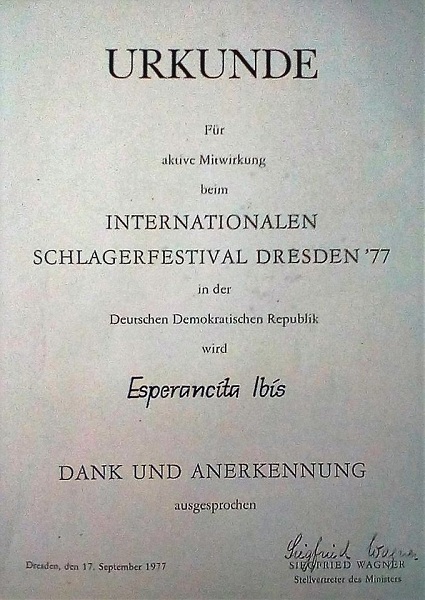 Varias intérpretes cantaron “La Lupe”, ya se sabe; mas aquella versión suya cargaba un señorío, una añoranza, que su autor nunca dejó de advertir. Ese sería el tema que llevaría consigo al Festival Internacional de la Canción de Dresde, en 1977. Una canción como un talismán. La delegación cubana la componían además, Osmundo Calzado, compositor y director de orquesta, y un joven que sonaba muchísimo, Héctor Téllez. En la cita debía interpretarse además una canción en alemán y así nació en su voz, Komm Janina (Ven, Janina).