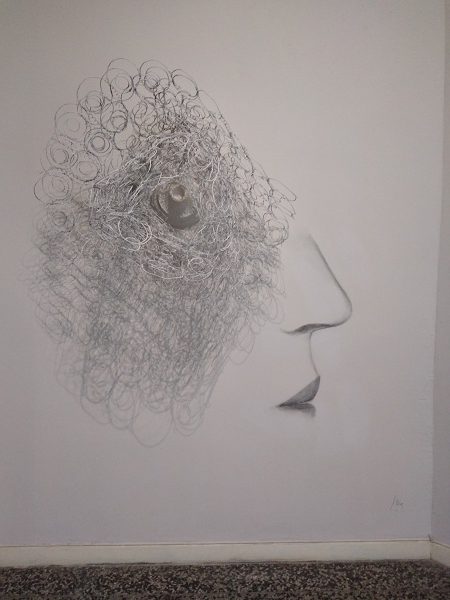 Ahora, por cierto, en Galería Habana no solo exhibe pintura, sino expone Ilusión, un rostro, todo en blanco, a medias dibujado con lápiz en la pared, cuya otra mitad sobresale por la blancura del cabello tejido en alambre que proyecta su sombra y permite completar, así, la visualidad de la pieza de manera intangible.