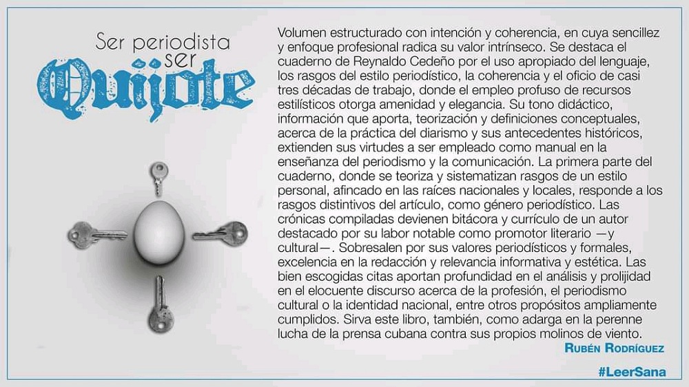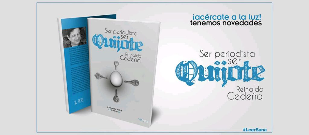 Publicado en 2016 en formato ebook por Ediciones Claustrofobias y Ediciones UO, de Santiago de Cuba, y ahora ampliado y revisado para La Luz, con edición de Liset Prego y diseño de Roberto Ráez a partir de una obra de Norlys Guerrero Pi, Ser periodista, ser Quijote incluye una selección de crónicas escritas por Cedeño en diferentes momentos, que nos demuestran que cuando el olfato y la vocación persisten, una crónica puede nacer del más insospechado de los acontecimientos. “Las crónicas compiladas devienen bitácora y currículo de un autor destacado por su labor notable como promotor literario —y cultural—. Sobresalen por sus valores periodísticos y formales, excelencia en la redacción y relevancia informativa y estética”, añade Rubén. ¿A cuántas personas habrá salvado el periodismo de Cedeño? ¿Cuántos momentos habrá fijado en nuestra memoria, como si fuese una fotografía que resiste al paso del tiempo, las crónicas de este amigo periodista? ¿Cuántos “seres de fábula en los lugares más mediáticos o en los rincones más invisibles del archipiélago cubano y en este mundo nuestro” habrán captado la mirada de Reinaldo? Ahí estuvo su mano para calibrar las historias, las vidas… “Nada hay tan pequeño que no pueda engendrar una crónica grande. La crónica es una apuesta al ser humano. No hay oxígeno sin memoria, no hay memoria sin cronistas”.