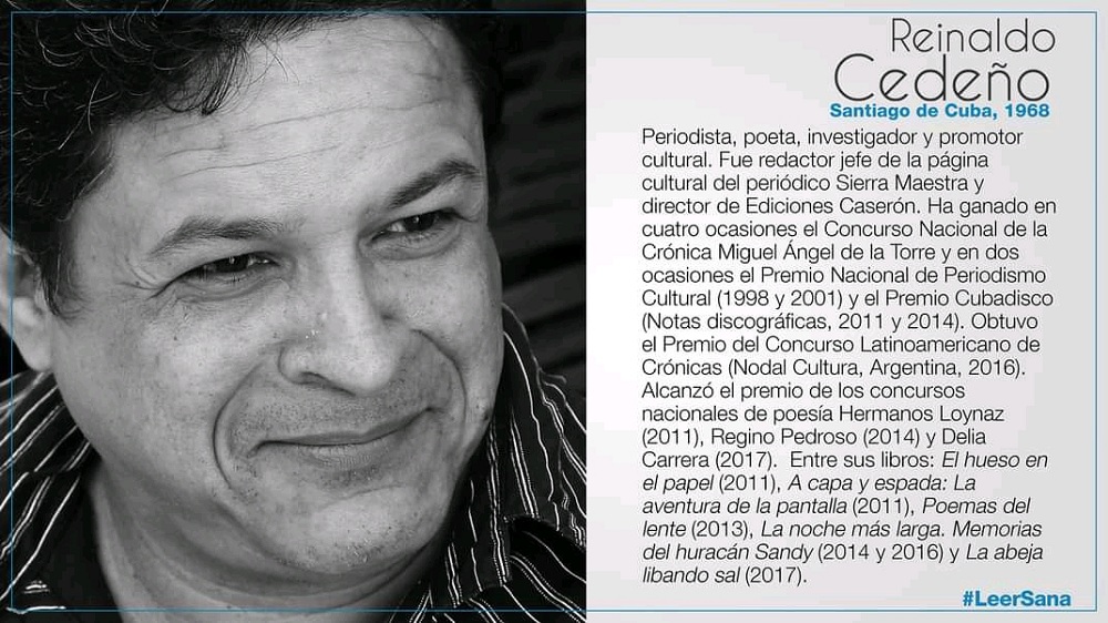 Cedeño es autor, además, de los poemarios Los corderos alzan la vista, Poemas del lente y Tejiendo un país; la investigación A capa y espada, la aventura de la pantalla; y los libros de periodismo cultural El hueso en el papel y Las pequeñas palabras, entre otros. Su nombre es asiduo, asimismo, en disímiles publicaciones en Cuba y fuera de la Isla. A los múltiples reconocimientos y premios por su quehacer reporteril y literario, como el Reconocimiento al Mérito Periodístico del ICRT en 2017 y el Diploma Nicolás Guillén de la Uneac en 2011, Reinaldo Cedeño suma una sencillez sin cortapisas que le ha permitido —con el asombro de quien, a pesar de la experiencia de la profesión, se maravilla como la primera vez— narrar la “novela cotidiana” de su Santiago de Cuba. De sus artistas y sus habitantes más sencillos. De su propia vida.