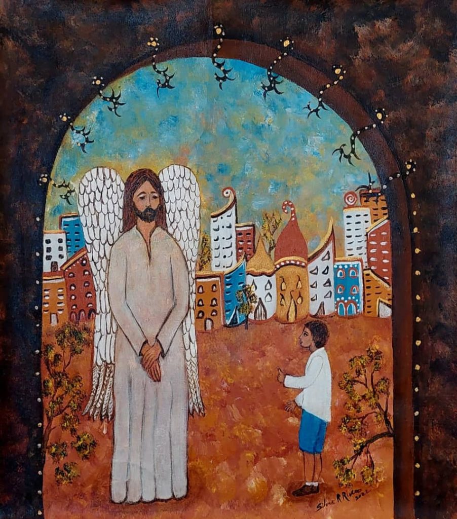 El tema de la poesía es otra de las iluminaciones salvadoras en este muestrario ya amplio de la obra de Silvia. Y ahí entra el contacto con Cintio Vitier y Fina García Marruz. Estas dos figuras tutelares están presentes en las temáticas y en la forma en que se tratan. El Cristo que surge por momentos en estas series está lejos de los altares; es un hombre común que aparece junto a los niños pobres, en una calle de cualquier villa. Si los demonios tienen esa dimensión tremenda, horripilante, la contrapartida celestial camina junto a las personas, se adentra en el universo humano, comparte con nosotros los mismos dolores y angustias. Las respuestas que deberían provenir de un Dios supremo están en el ser humano y su constante búsqueda de sabiduría y de bien. En tal sentido, el tema del viaje (visto sobre todo en los cuadros sobre la emigración) nos sugiere la emergencia de un traslado hacia adentro, más que hacia otras latitudes. Viajar implica conocer, y ello se puede hacer desde la inmovilidad del artista en su sitial de privilegio: la sensibilidad.