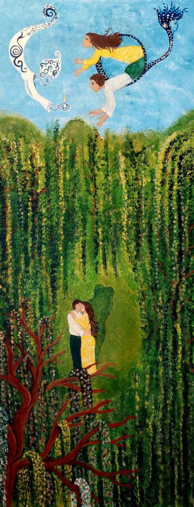 Así, en sus más recientes obras, Silvia se vale de otros temas como la emigración, que tan común y tanto nos golpea hoy. En esas piezas no solo aparecen personajes reiterados en series anteriores, sino que se transmutan y asumen el ropaje de un conflicto que interpela a la nación y que de alguna manera restablece paralelismos con los demonios remedianos. Si antes el foco estaba en ese pasado lleno de diablejos que salen del interior de la patria y que la combaten, ahora hay una búsqueda hacia afuera. En ambas ocasiones existe una defensa de lo propio que se aleja de demarcaciones mediocres y que no le teme a la complejidad ni al carácter polisémico de la pintura. El mar y el color azul sustituyen los tonos ocres y rojizos de los avernos que rodean a Remedios. Hay una angustia más sutil, casi silenciosa en esta temática, la cual queda retratada en los diferentes cuadros.