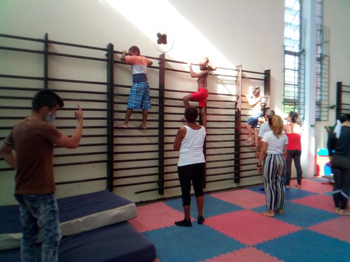 En estos momentos no contamos con la piscina, por ello todas las actividades tienen lugar en el gimnasio de nuestra institución, donde trabajamos todo lo relacionado con el desarrollo de habilidades motrices básicas, que después de experiencias acumuladas y resultados de investigaciones realizadas, se han ido haciendo cada vez más complejas. Actualmente, por ejemplo, trabajamos en la acrobacia y la escalada.