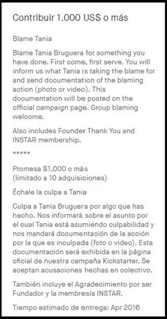En cualquier caso, no seré yo el único a quien pincha la suspicacia. ¿Cuál, si no esa contingencia, provocaría que en las propias bases del concurso Tania Bruguera avise del carácter transparente de los fondos para premios? Sin embargo, nos presenta el concurso como obra de su generosidad y expresión de su sentido patrio. Poniendo por delante a INSTAR, proyecto subversivo del que ya hablamos en “Tania Bruguera, libertad de expresión bajo oferta y demanda”, publicado en La Jiribilla.