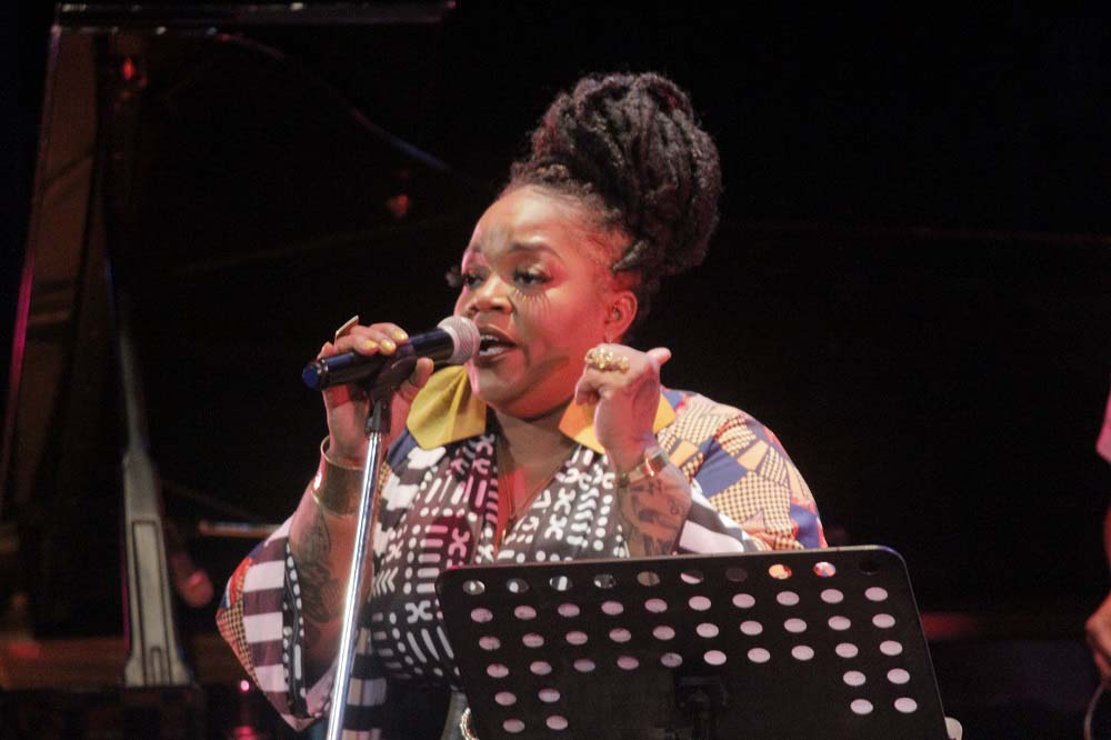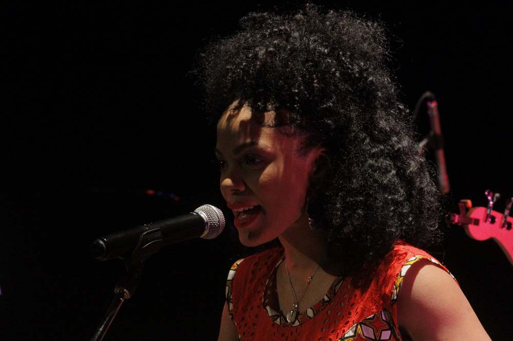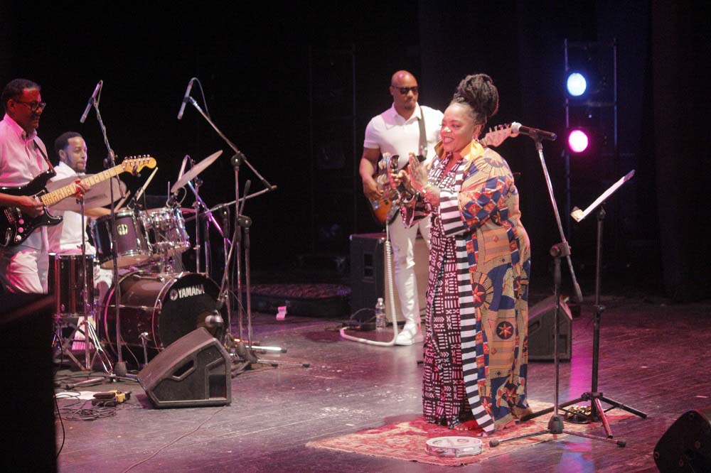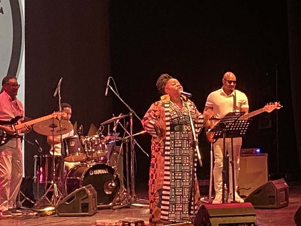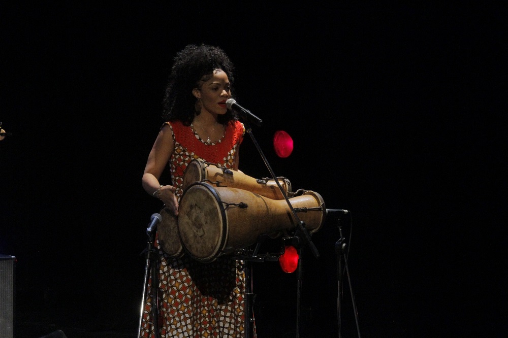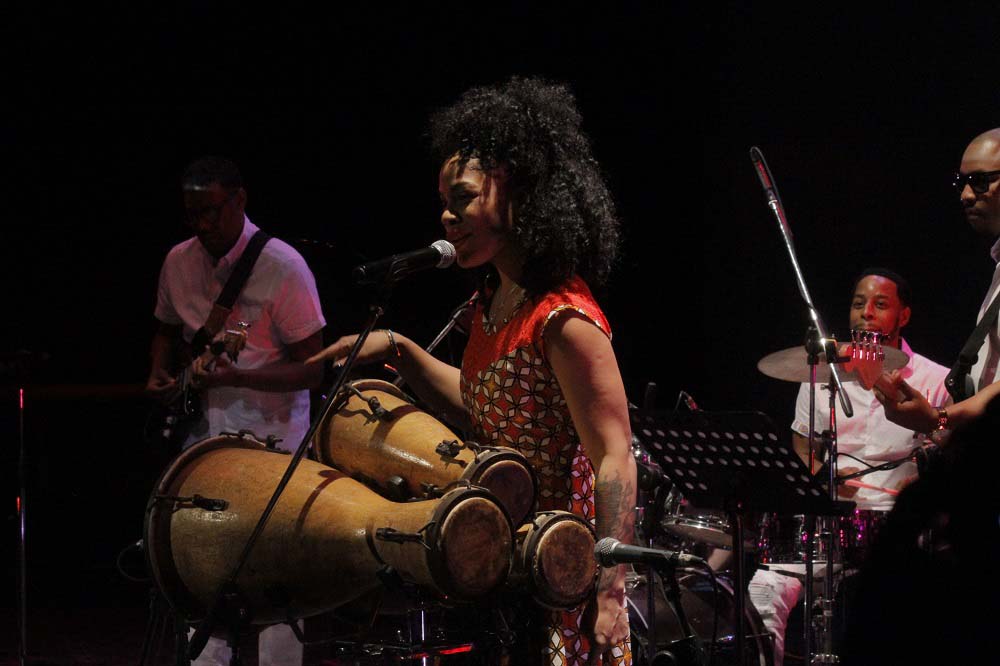 Estaba descalza. En la estera que sus pies pisaban, reposaba a ratos una pandereta. Un vestuario colorido, un moño alto, aretes grandes y llamativos completaban una imagen que proyectaba orgullo y respeto hacia sus raíces. Su banda, conformada por Darrin Thomas en el piano, Lucas Singletary en el bajo, Walt Lundy en el drums, y Caleb Armstrong en la guitarra, vestía de blanco. Sin duda, constituyó un acompañamiento de lujo, con perfecta sincronía y empaste.
