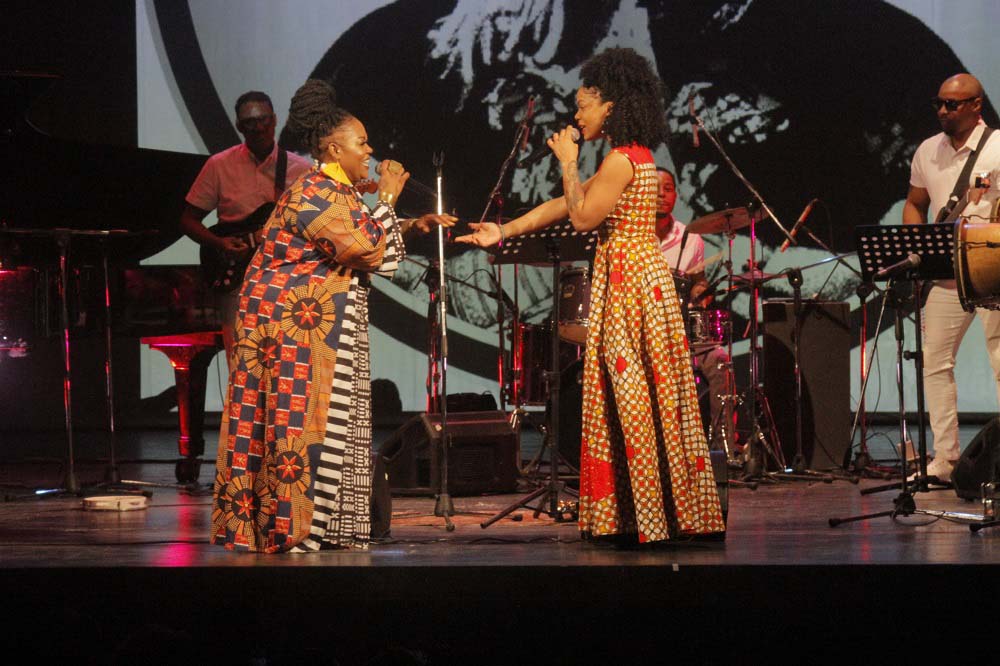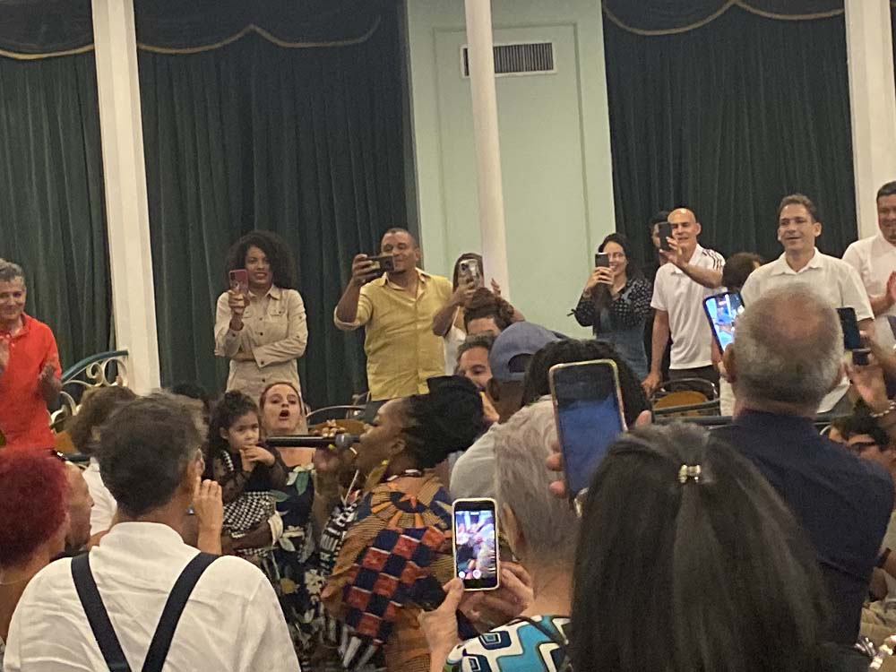 “Music all over the world” fue el tema al que se sumaron los tambores batá. La cantante y percusionista Brenda Navarrete compartió escena con ella, y ante todos mostraron su cariño y empatía. Juntas derrocharon apego a la música afro, a los cantos de corazón, a las deidades, a las sonoridades legendarias de un continente que tanto ha sufrido y que tanto le ha dado al mundo. Volvieron a reunirse al final, cuando de manera improvisada se retaron una a la otra cantando “Kimbala” y evitando que la lengua se enredara.