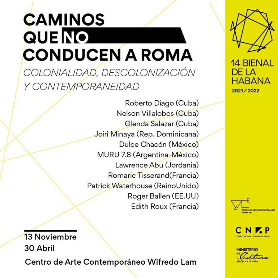 Caminos que no conducen a Roma, en el Centro Wifredo Lam, fue el título de la primera puesta en escena con instalaciones, videos y fotografías. Allí se compuso bajo el eje temático general del evento Futuro y contemporaneidad, todo un repertorio de muestras de Argentina, México, Francia, Sudáfrica, Jordania, Reino Unido y Cuba, en su diálogo con los temas de ecología, violencia, cruces informativos, las migraciones y los géneros. Actúa así este sitio como una muestra dinámica y flexible que se modifica en el tiempo entre experiencias.