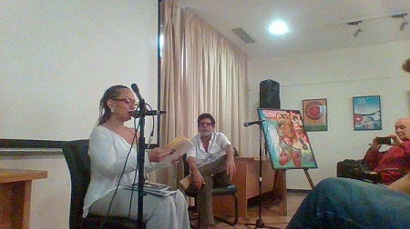 Un espacio para la descarga entre amigos en el salón Federico García Lorca, del Centro Cultural Dulce Maria Loynaz se propicia cada cuarto jueves del mes al filo de las cuatro de la tarde, teniendo como anfitriones al escritor Edel Morales y al trovador Charly Salgado. Este 28 de febrero las invitadas principales fueron la poeta Liliana Rodríguez, recientemente galardonada con el premio de CubaPoesía Eduardo Kovalivker 2018 con el libro In adsentia. Creadora versada además en el arte de la improvisación decimística, por la cual ha recibido los más importantes galardones de la lírica espineleana, que funge en estos momentos como vicepresidenta de la Asociación Hermanos Saiz, y, desde la Plata austral, la poeta argentina Claudia Baldoni, quien fuera participante en la más reciente Feria Internacional del Libro de La Habana y ya estaba a pocas horas de su regreso a la patria de Borges, Cortazar y Gelman. Acompañó el encuentro la obra plástica de Jorge Luis Martínez Camilleri, con su ecléctica visión de lo cubano entre el naif y el pop de su paleta.