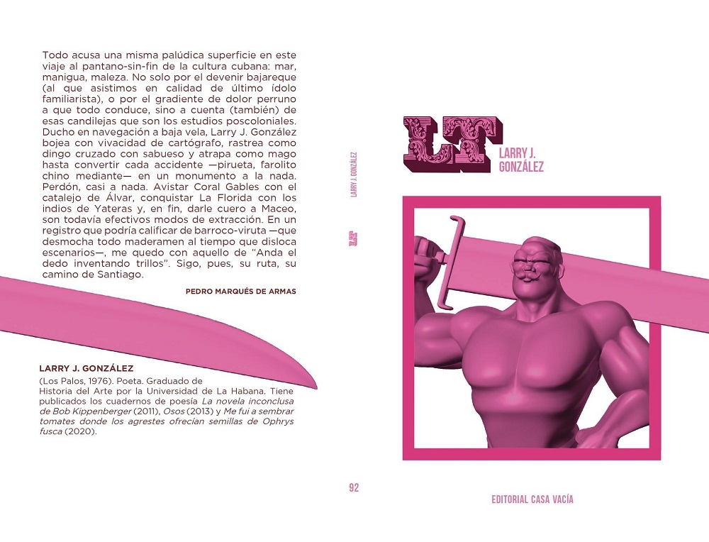 Confundir el pasado con el presente mixturando lo intrascendente del pasado y lo trascendente del presente es una de las maneras en que Larry logra la originalidad y la intensidad, y es fiel a una poética que construye una balada de lo impreciso, donde son consustanciales la alusión, los ocultamientos, la codificación, las referencias, sutiles o complejas, a elementos específicos de una subcultura, la carnavalización, entre otras formas, pruebas de las múltiples texturas de que hacen gala estas construcciones bien urdidas. Lo que habla a favor de su autor, si pensamos en otros poetas jóvenes cubanos, más interesados en decir que en potenciar su discurso. Un ejemplo puntual de dichas referencias sutiles son los motivos de índole homoerótica que aparecen en las formas más insospechadas o escurridizas, por no decir casi siempre intelectivas, ofrecidas o no desde la simulación, dígase una película sobre el tema, un actor, un famoso bar, un reconocido artista plástico con esa condición, el significativo travestismo del “yo lírico”, la irrupción de un anhelo, etc. Pareciera que el texto tiene un destino incógnito como la realidad —he ahí una de sus mejores virtudes—, pues hay un relato metafórico detrás de estas historias cotidianas y tribales que entrega, del solo y su bestiario, que encarna como misterio en lo real. Pareciera que este poeta ha llegado para asombrarnos siempre y desde su preludio, pues los caballos vencedores son los que se ven en el momento de partir.
