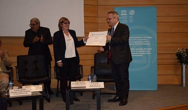 El secretario de la Convención de Patrimonio Cultural Inmaterial, Tim Curtis, hizo entrega del título que acredita oficialmente al punto cubano como Patrimonio Cultural Inmaterial de la Humanidad a la presidenta del Consejo Nacional de Patrimonio Cultural de la nación caribeña, Gladys Collazo, con la presencia en el acto del destacado intelectual Miguel Barnet, presidente de la Unión Nacional de Escritores y Artistas de Cuba (Uneac).