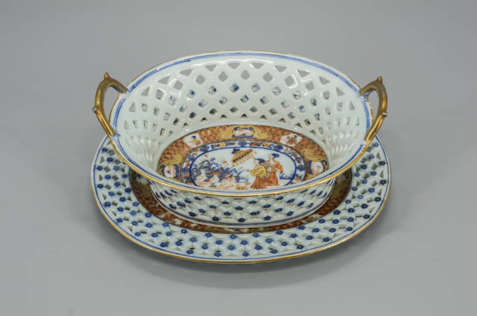 La vajilla está compuesta por un total de 361 piezas divididas en unas 28 tipologías. Entre ellas podemos encontrar bandejas, fuentes, platos llanos y hondos así como soperas, por solo citar ejemplos. Tal vez una de las piezas más impresionantes del conjunto sean unas pequeñas cestas y sus respectivas fuentes ovales, que fueron concebidas para contener frutos del bosque como grosellas, arándanos o fresas. Se trata de piezas cuya decoración denominada linglong (玲珑) consiste en un cuerpo cerámico completamente tallado en forma de rombos dando una imagen semejante a una cesta. En el punto de unión de cada una de las bandas que componen el patrón geométrico se aprecia una diminuta flor creada a partir de un molde, la cual está decorada con esmalte azul cobalto y ligeros toques de oro. Del esquema decorativo aplicado en estas piezas podemos encontrar referencias en textos antiguos refiriéndose a esta técnica como una de las más difíciles de lograr en la cerámica y, por tanto, ejecutada por grandes, aunque escasos maestros. La expresión Guifu-Shengong (鬼父神工) con la cual los antiguos se referían a esta técnica, se traduce literalmente como “artesanalidad superior”. Por su parte, el término linglong en mandarín se traduce como “exquisitamente tallado”, aunque algunos expertos sostienen que el vocablo es una derivación onomatopéyica del sonido que producen dos piezas de jade que chocan entre sí.