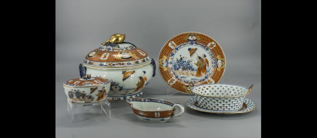 El período de Qianlong (乾隆), cuarto emperador de la dinastía Qing (1644-1911), quien gobernó el país entre 1736-1795, es considerado como el que mejor asimiló los códigos occidentales en la producción de porcelana. Desde inicios del siglo XVIII los contactos con Europa eran cada vez más directos, incluso en Beijing, donde los emperadores se reunían con enviados, principalmente monjes católicos, occidentales. Los intercambios aumentaron exponencialmente y la influencia de las artes entre ambas regiones no se hizo esperar. Resulta habitual encontrar elementos iconográficos occidentales en la porcelana china de segunda mitad del siglo XVIII, al igual que el empleo de esmaltes importados por los europeos y que eran totalmente desconocidos en el gigante asiático. En el caso de la vajilla de La dama del parasol, se trata de un encargo donde no solo el diseño de lo representado es de origen occidental, sino también el de cada una de las piezas, por lo que las formas de bandejas ovales, cestas para frutas y otros componentes fueron originados en Europa.