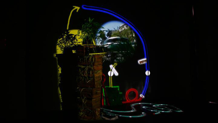 En la expo, la técnica del videomapping artesanal —según escribe su curadora en el catálogo—, “se propone como un uso particular y antimonumental del mapeo informático del espacio físico”, y “las luces proyectadas no surgen de softwares comerciales ni plantean mimetismos o efectismos realistas, sino que proponen, desde la abstracción un nuevo ilusionismo y una espectacularidad singular”.