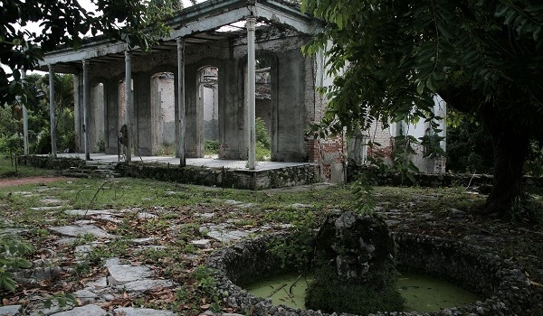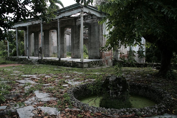Las escaleras del fondo conducen a un patio donde antaño hubo un pequeño zoológico. Un tanque enorme expone su herrumbre al cielo y a las lianas. El descenso, también planificado, nos lleva hasta el río, surcado por árboles gigantes. La entrada lateral de los coches poco a poco se desgrana, se hunde.