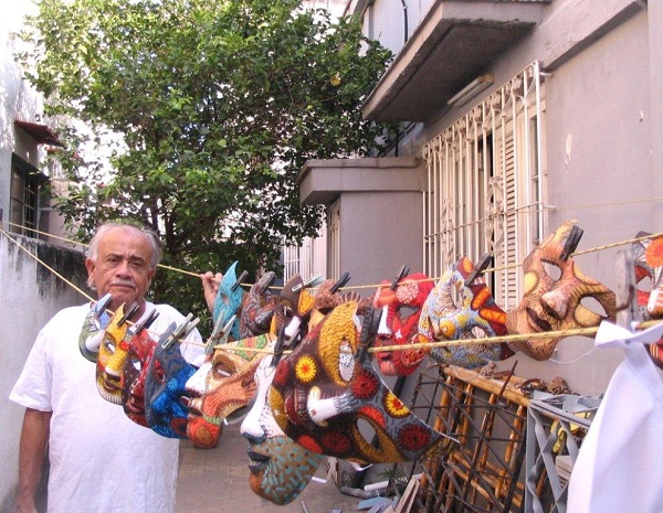 Las máscaras que concibo son deudoras de aquellas en ‘criollo papier maché’ realizadas —siendo adolescente— en el taller de pintura decorativa, escenográfica y comercial de mi padre Manuel López Montero (conocido artífice manzanillero); entonces destinadas a los carnavales de mi ciudad natal.