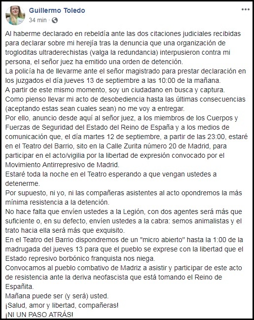 Declaración de Willy Toledo. Publicada el lunes 10 de septiembre, a las 2:00 p.m., hora de España