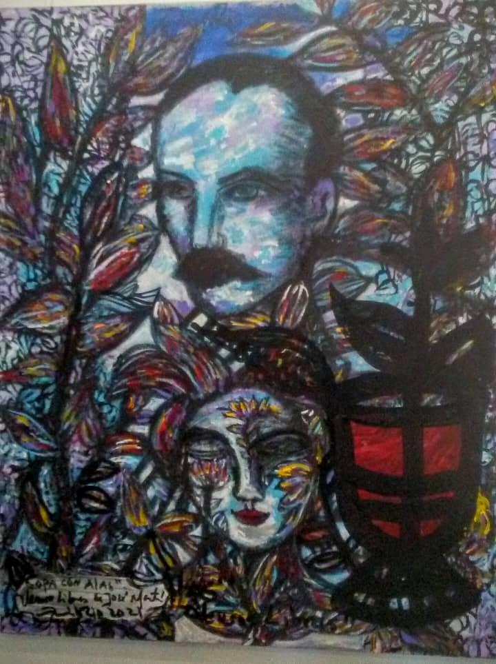 Un cuadro llama poderosamente la atención y es su homenaje a José Martí. Sabidos son los pasajes en la obra de nuestro Apóstol donde él habla del vino. La imagen se usa para recrearnos a un hombre capaz del goce. Su ideal de justicia permanece representado en tonos azules y pálidos. Si el resto de la muestra es una explosión de rojo, Martí aparece incólume, aunque rodeado también de copas. Hay un instante de respeto y de seriedad en ese espacio y el héroe nos mira con fijeza desde su tiempo detenido. Zaida quiso decirnos que el vino también nos procura pensamiento y acción comprometidos con el cambio social y con un mejoramiento humano. Por contradictorio que parezca, la bebida es también un vehículo para la lucidez y el viaje a las regiones más preclaras de la mente en las cuales nace el ideal cimero de la libertad. José Martí tiene que ser necesariamente el ícono que Zaida realce en este pasaje de su obra y por ende más allá de una intención ideológica está el propio derecho de la artista de apropiarse de la historia y rehacerla a su manera, con todos los trazos y las vivencias posibles.
