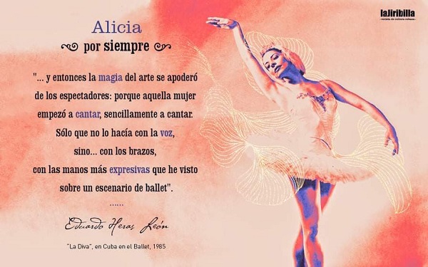 En una ocasión como la de este día, resulta imperioso deber afirmar que hubo otras Alicias, que están más allá de esas hazañas y de sus milagros escénicos como Giselle, Odette-Odile, Swanilda, Lisette, Kitri, Aurora, Carmen, Yocasta, La Diva, Carolina, Ate o Lizzie Borden, por solo citar los más familiares. Es la Alicia guía y mentora, la que con su don aglutinador logró convocar en La Habana, en 26 festivales internacionales de ballet, a las más célebres personalidades de la danza, en una fiesta de arte y amistad que cumple más de medio siglo; y está también la que vimos entregar lo mejor de su magisterio, lo mismo en escenarios de la más alta prosapia que en rústicas tarimas en plazas públicas, fábricas, escuelas y unidades militares, consciente de que al pueblo, cualquiera que este sea, siempre se asciende y nunca se desciende.