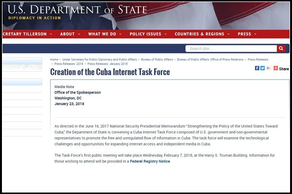 «Según lo dispuesto en el Memorando Presidencial de Seguridad Nacional del 16 de junio de 2017 ‘Fortalecimiento de la política de los Estados Unidos hacia Cuba’, el Departamento de Estado está convocando a un Grupo de Tareas de Internet para Cuba compuesto por representantes gubernamentales y no gubernamentales de los Estados Unidos para promover el flujo de información en Cuba. El grupo examinará los desafíos tecnológicos y las oportunidades para ampliar el acceso a internet y a los medios independientes en Cuba.