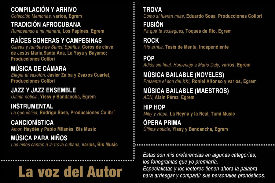 ¿Carencias?, los especialistas, musicólogos, productores, casas discográficas y músicos podrán señalar algunas. Considero, no obstante, que ha sido diverso en un diseño que, por supuesto, debe perfeccionarse. Si me preguntan, creo que Toques del Río, la banda de jóvenes pinareños, debió estar también nominada en Ópera Prima con su fonograma Pa´ que te sosiegues; que el disco Raíz, del Septeto Santiaguero, debió estar en Música Popular Tradicional, no en Raíces Soneras y Campesinas, donde llegan novedades como los discos del Coro de Claves y el Septeto Espirituano, verdaderos aportes al rescate de nuestras raíces musicales. En fin, esas son solo sugerencias de un amante de la música cubana, no de un especialista.