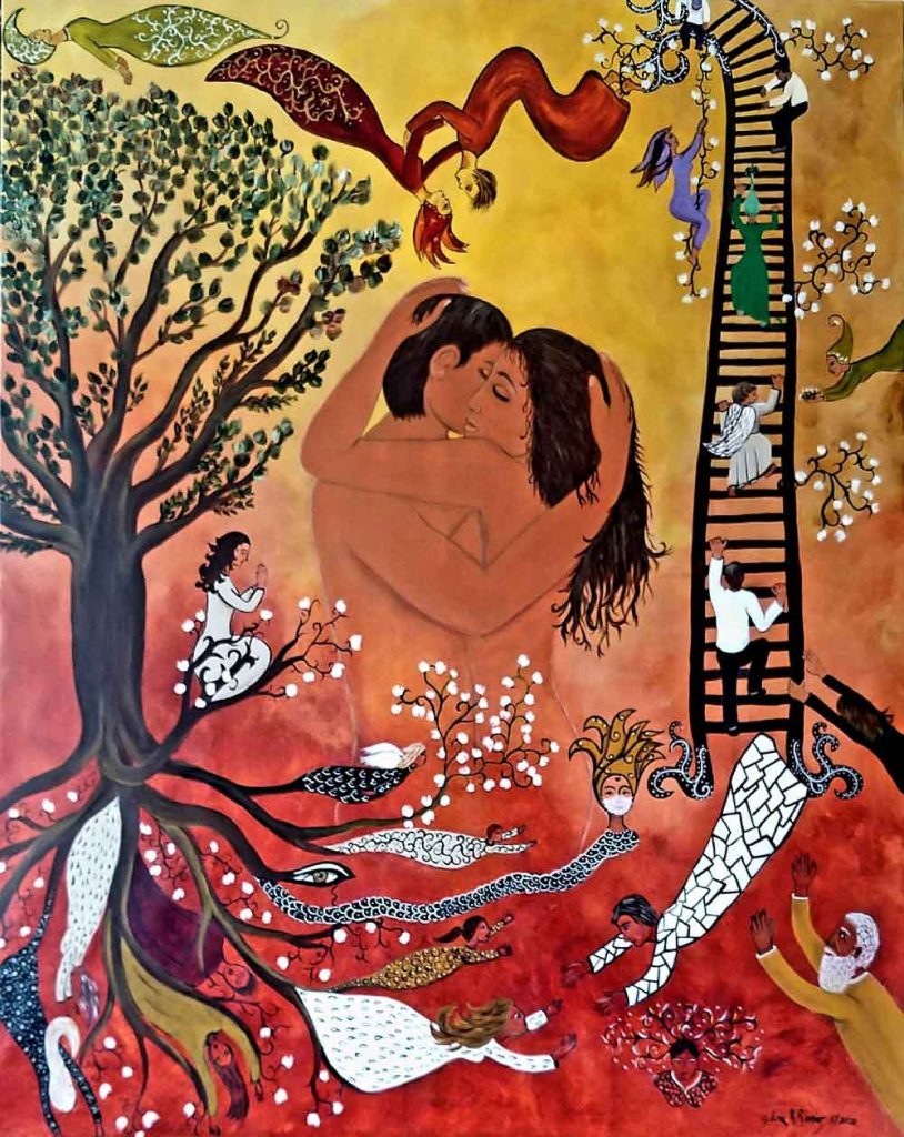 Recorrer la exposición Sueños en vilo implica acceder a una inesperada recarga del optimismo cotidiano al permitírsenos, una vez más, asumir la sanadora poética del amor. En este desfile de piezas matizadas por el aliento de la femineidad como motivo recurrente, nos encontramos con los emblemáticos retablos de Silvia, en específico con los titulados “Abrazos” y “Si no fuera tu mirar”, marcados por una exquisita quietud que recuerda la atmósfera de entornos apacibles. La artista se las ingenia para recrear las esencias de un paraíso idealizado a través de colores tenues que acentúan la impresión de que nada podrá interrumpir el acto amatorio entre las parejas, como también aparece hermosamente evocado en la pieza “Entropía del amor”.