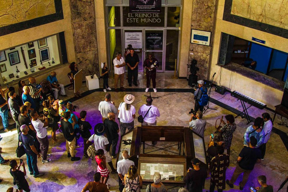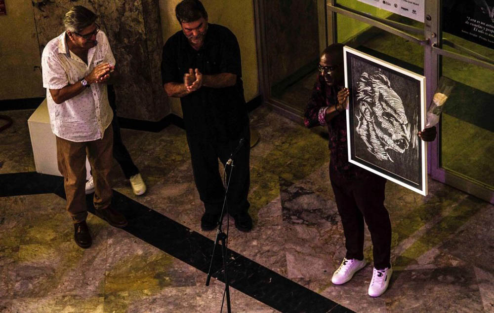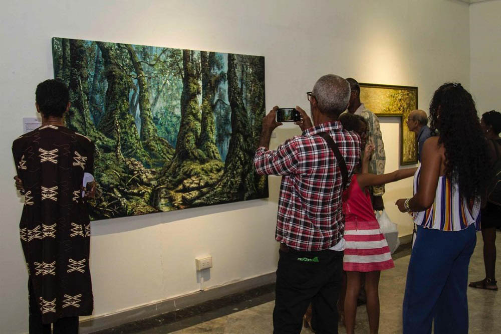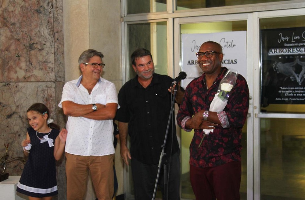 Un nutrido público asistió a una velada que comenzó con la interpretación del reconocido músico y showman Bobby Carcassés y su grupo, seguido de las palabras de bienvenida a cargo de Omar Valiño, director de la Biblioteca Nacional, las de quien esto escribe sobre las virtudes de Arborescencias y, finalmente, las palabras del artista agradeciendo las ayudas recibidas para la exposición. En ese momento inicial Lara donó un retrato de José Martí de su autoría a los fondos pictóricos de la institución.