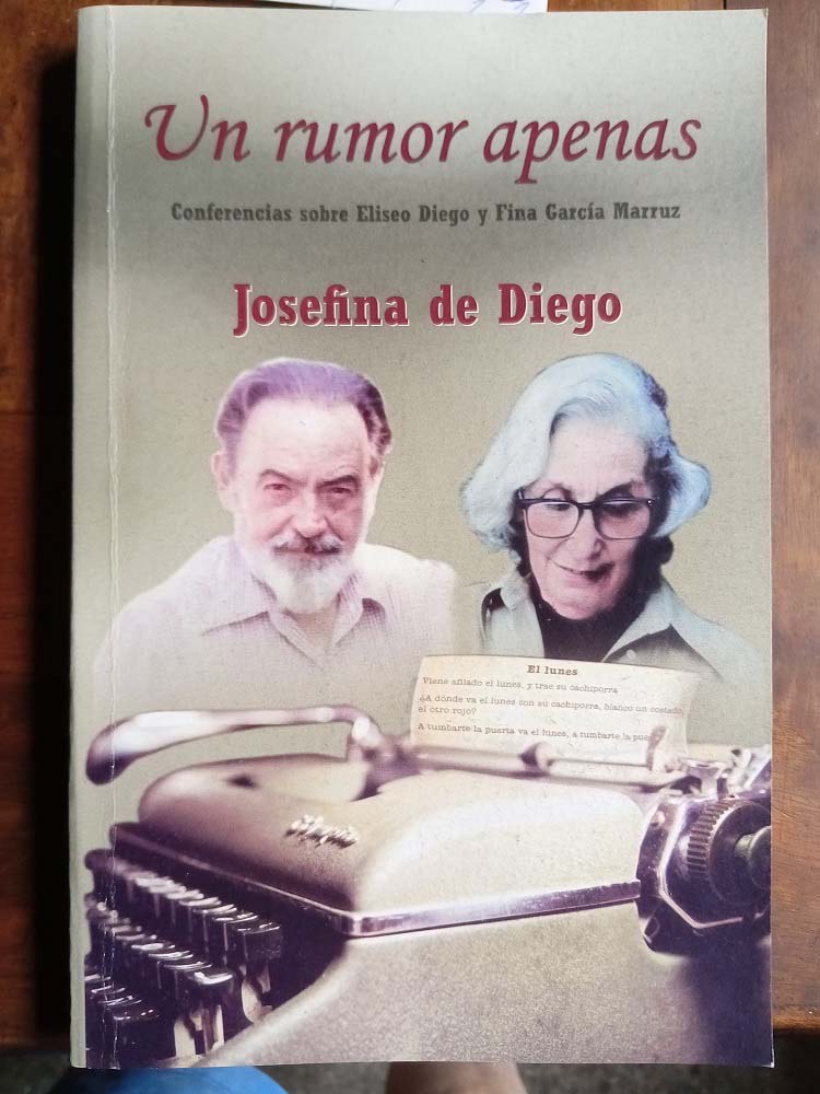 A partir del ordenamiento de la biblioteca del poeta, narrador, ensayista y traductor Eliseo Diego, su hija, Josefina de Diego, preparó las cuatro conferencias incluidas en Un rumor apenas. Conferencias sobre Eliseo Diego y Fina García Marruz (Ediciones Extramuros, La Habana, 2019, 248 pp.).