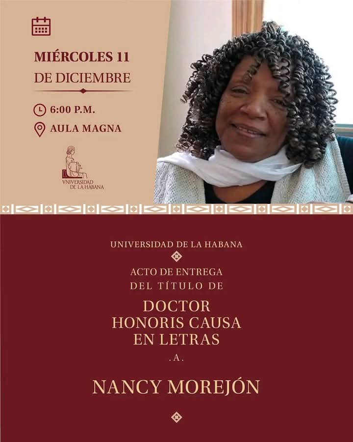 La Universidad de La Habana reconocerá a la poetisa, escritora, crítica literaria y traductora cubana Nancy Morejón, Miembro de Honor de la Unión de Escritores y Artistas de Cuba (Uneac), con el título de Doctor Honoris Causa en Letras por su amplia trayectoria en el mundo de la cultura, este 11 de diciembre en el Aula Magna.