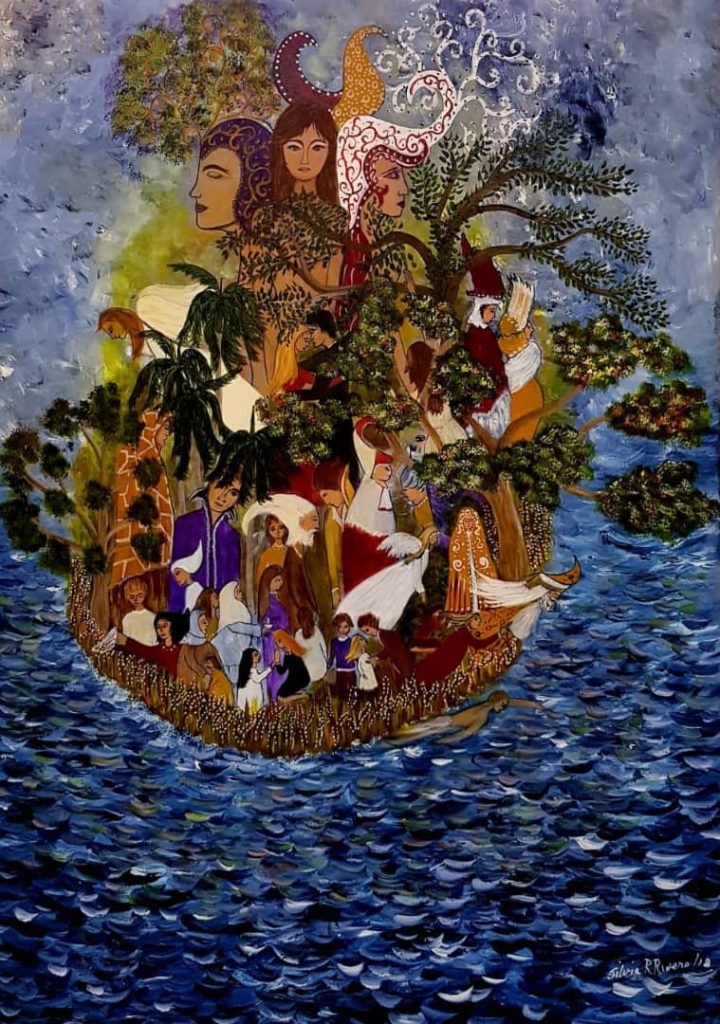 Así, en sus más recientes obras, Silvia se vale de otros temas como la emigración, que tan común y tanto nos golpea hoy. En esas piezas no solo aparecen personajes reiterados en series anteriores, sino que se transmutan y asumen el ropaje de un conflicto que interpela a la nación y que de alguna manera restablece paralelismos con los demonios remedianos. Si antes el foco estaba en ese pasado lleno de diablejos que salen del interior de la patria y que la combaten, ahora hay una búsqueda hacia afuera. En ambas ocasiones existe una defensa de lo propio que se aleja de demarcaciones mediocres y que no le teme a la complejidad ni al carácter polisémico de la pintura. El mar y el color azul sustituyen los tonos ocres y rojizos de los avernos que rodean a Remedios. Hay una angustia más sutil, casi silenciosa en esta temática, la cual queda retratada en los diferentes cuadros.