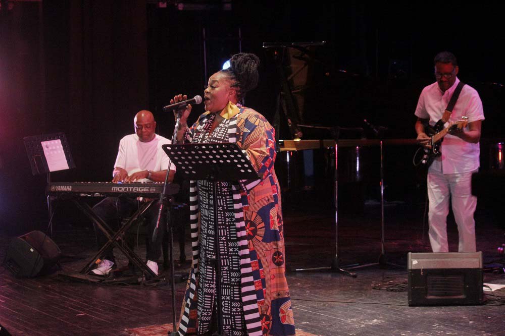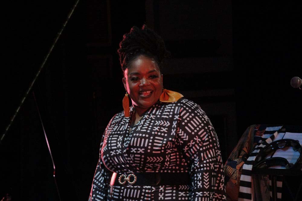Estaba descalza. En la estera que sus pies pisaban, reposaba a ratos una pandereta. Un vestuario colorido, un moño alto, aretes grandes y llamativos completaban una imagen que proyectaba orgullo y respeto hacia sus raíces. Su banda, conformada por Darrin Thomas en el piano, Lucas Singletary en el bajo, Walt Lundy en el drums, y Caleb Armstrong en la guitarra, vestía de blanco. Sin duda, constituyó un acompañamiento de lujo, con perfecta sincronía y empaste.
