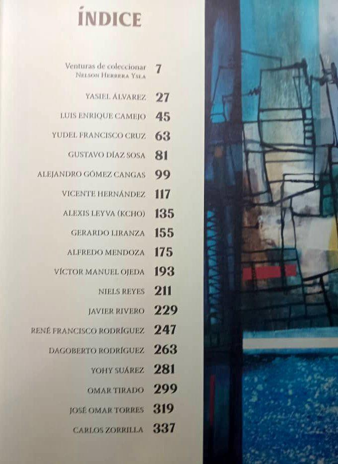 Uno de los más entusiastas promotores de esta idea ha sido el maestro José Omar Torres, de quien se escogió un fragmento de su obra titulada Litoral habanero, 2021 (acrílico sobre lienzo, 123x200cm.), incluida en el libro, para diseñar la página correspondiente al índice y que abre el volumen.