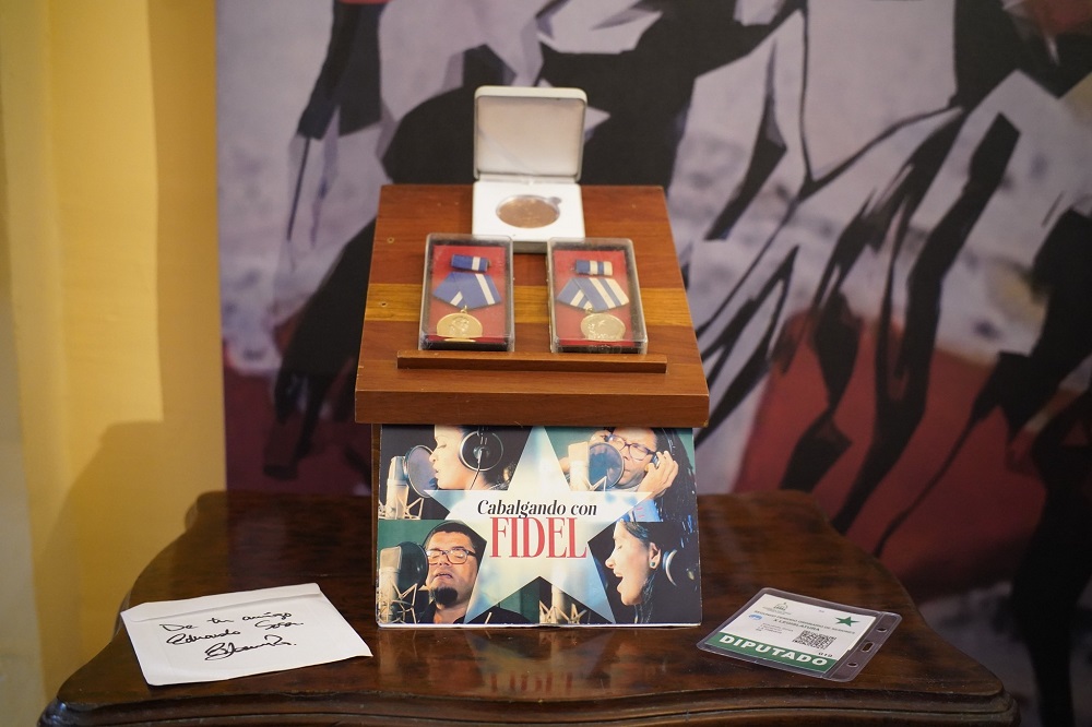 La guayabera, esa prenda que vistió sus momentos más significativos, ahora descansa junto a las de Silvio Rodríguez y Sindo Garay, en un diálogo silencioso entre generaciones de trovadores. Las medallas —la Alejo Carpentier, la Raúl Gómez García— hablan de reconocimientos que nunca buscó, pero que llegaron como eco de su arte auténtico. La credencial de diputado recuerda al hombre comprometido, al que llevó la voz de la cultura hasta la Asamblea Nacional del Poder Popular. Y el disco Cabalgando con Fidel, testimonio sonoro de su lealtad y fidelidad, letras que reposan en el imaginario colectivo de toda Cuba.