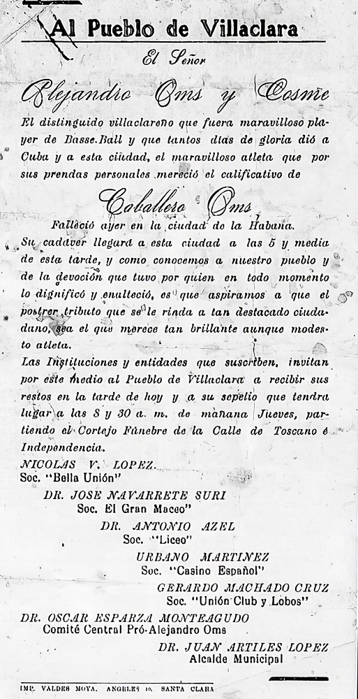 Una gacetilla publicada en el diario La Publicidad de Santa Clara, en diciembre de 1923, año en que los Leopardos dominaron con holgura a sus rivales y ganaron su primer campeonato, afirmaba: “Cuando Oms va al bate, va toda Villaclara” y era estimado en ese momento “el mejor pelotero cubano y el mejor y más completo de entre todos los que integran las cuatro unidades del actual campeonato (…) como Charleston, más que estrella es otro sol. En sus piernas de gamo y en su majagua criolla el triunfo siempre está aleteando”.