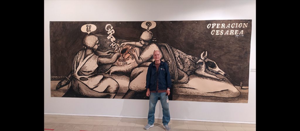 Esta pieza, hecha en 1973, está en la sala permanente y se ha trasladado momentáneamente para esta exposición, pero pertenece a la colección del Museo. Está realizada con pintura de caseína sobre papel —que a su vez está pegado sobre masonite— y es como uno de los tesoros del museo. Mide 165 x 209 centímetros. El fascismo, lamentablemente, siempre resurge a partir del militarismo exacerbado, y yo he querido mostrar las piezas realizadas en los años 70 al lado de las producidas en los 2000 sobre la misma temática. Y lo que más me conmueve es constatar que esas posturas “fascistoides” no han cambiado a pesar del paso de los años: ese señor fascista que se siente por encima de todo y de todos: el mundo lo vive todos los días.