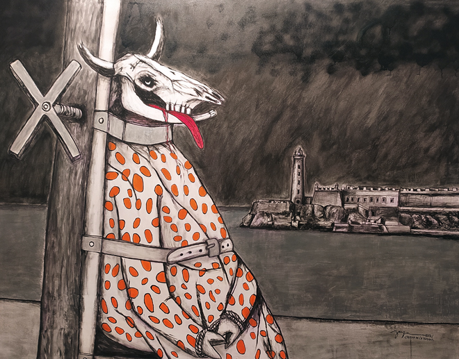 También se muestra el óleo sobre lienzo “Bobadilla, restos de Maceo”. Una apropiación del cuadro de Armando Menocal “La muerte de Maceo”, que está en la colección del Museo de la Ciudad. Este cuadro fue para mí muy importante, porque lo vi por primera vez cuando era un niño y me impresionó sobremanera. Interpreté ese cuadro con una visión más mía: Maceo está dentro en un ruedo, ya muerto. Aparece el símbolo del toro porque los militares españoles decían que Maceo los había “toreado” durante toda la invasión desde Oriente a Occidente y nunca lo pudieron capturar. Aparece el símbolo de Oggún-Zarabanda —porque se asegura que Maceo era practicante de la Regla de Palo Monte— y le coloco el símbolo de Oggún-Zarabanda porque fue nuestro gran guerrero.
